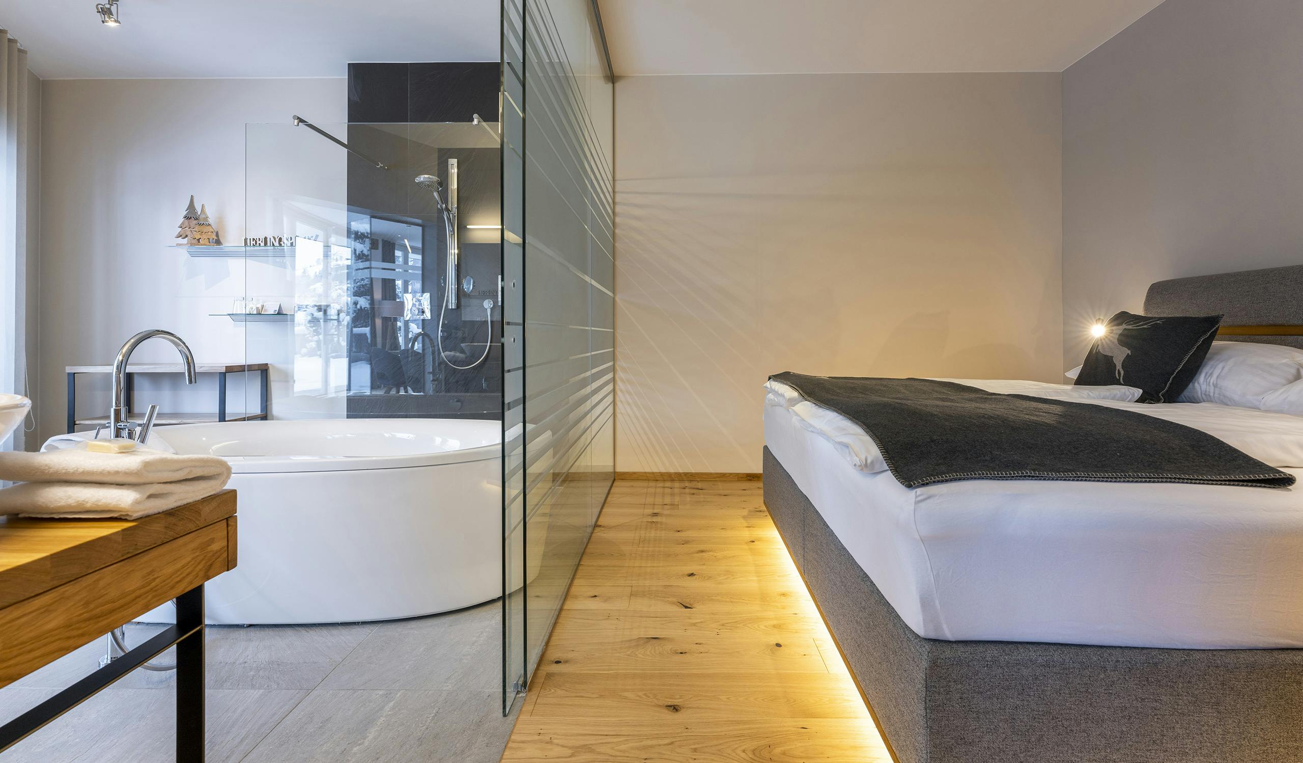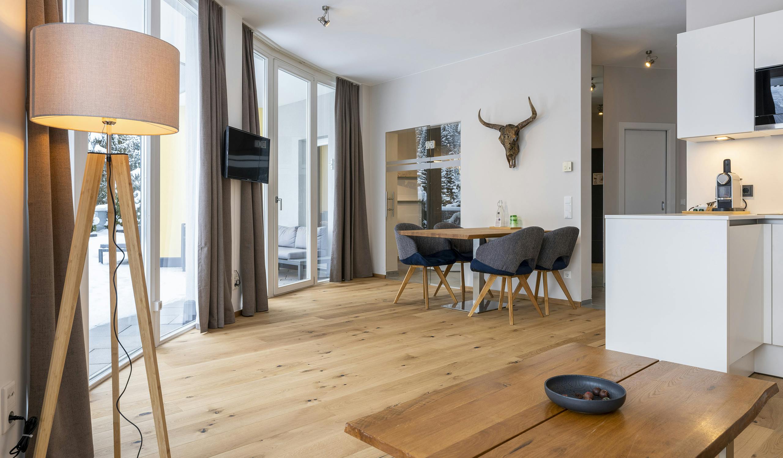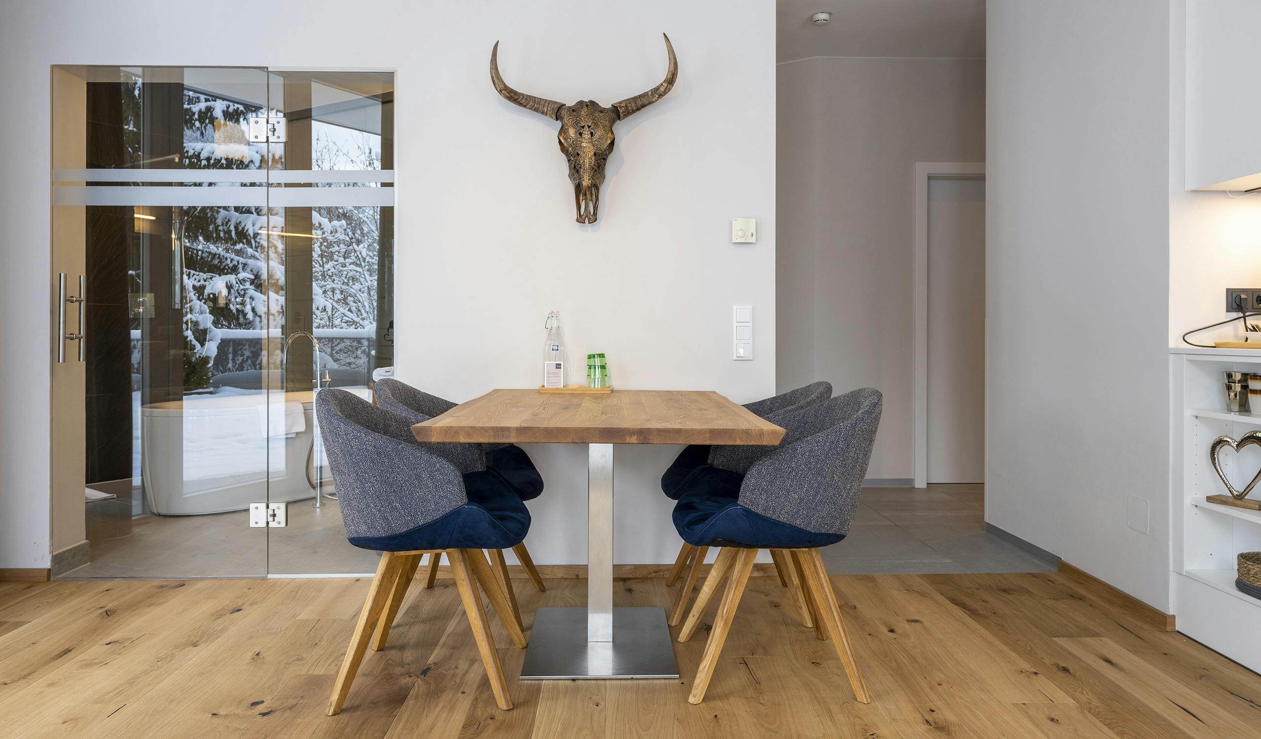 Modern eingerichtete 2-Raum Superior Suite "Spieleck" mit extra viel Platz für die ganze Familie oder mit Freunden und einem großartigen Panoramablick auf die Glemmtaler Bergwelt für entspannte Urlaubstage. Unsere Suite "Spieleck" verfügt über 1 separates Schlafzimmer, 1 Bad, Wohnbereich, vollausgestatteter Küche, Schlafcouch für zwei weitere Gäste und einem gemütlichen Essbereich.