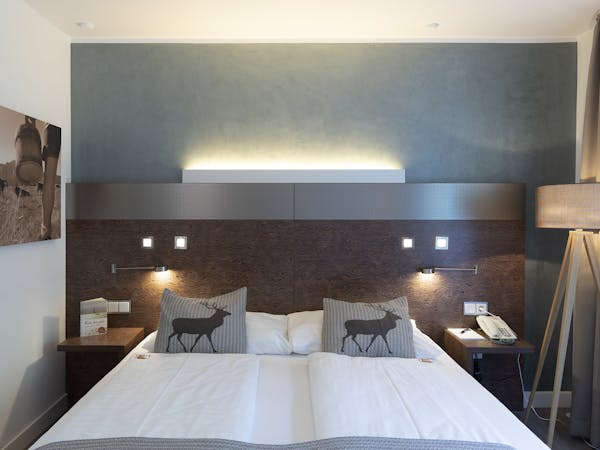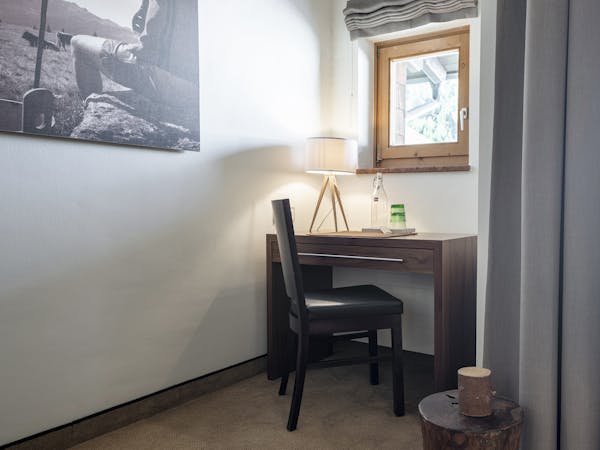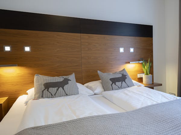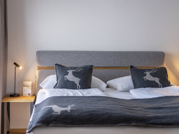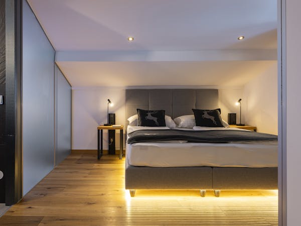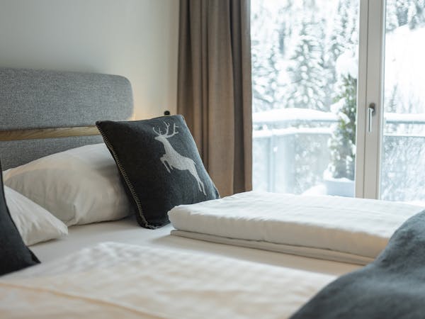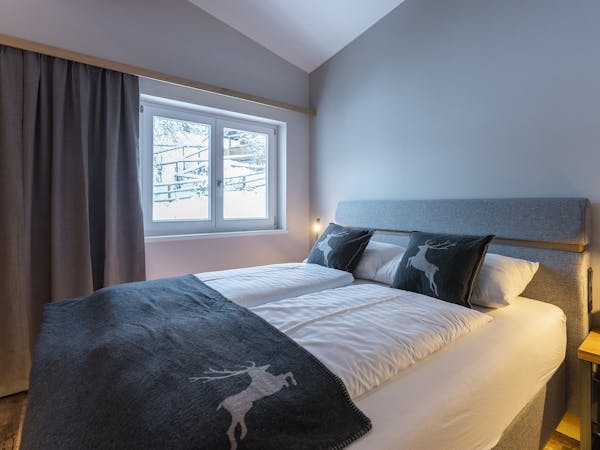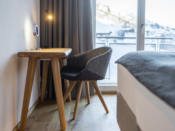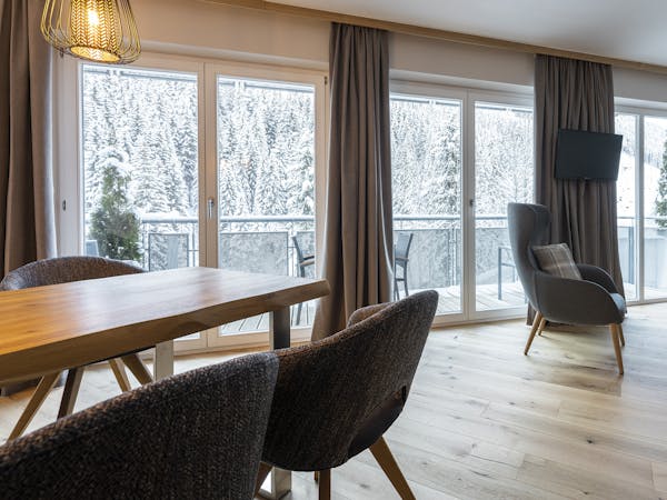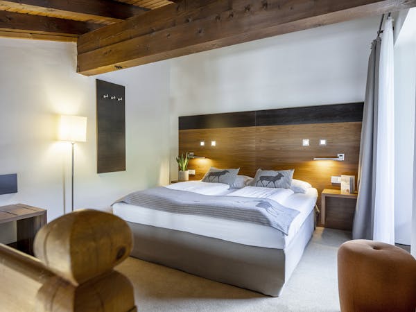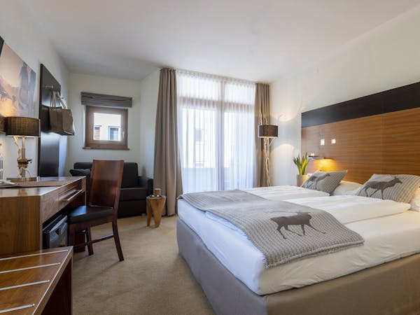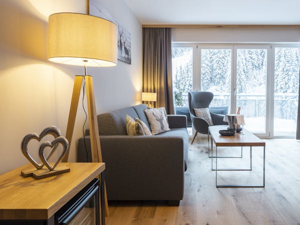 Modern furnished Superior Suite with panoramic mountain view and guests who like a bit extra space for a longer stay. The suite offers two separate bedrooms, two separate bathrooms and living room with a sofa bed for a fifth or sixth person.