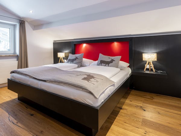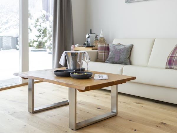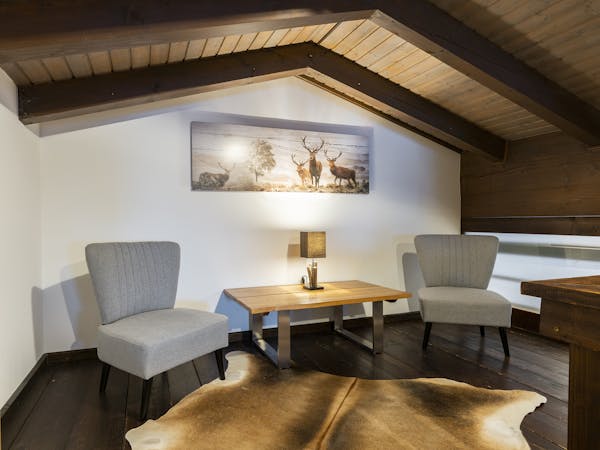 Modern furnished alpine chalet suite with panoramic mountain view and guests looking for something special. The suite offers two separate bedrooms (on a split level) and living area with a sofa bed for a fifth or sixth person.