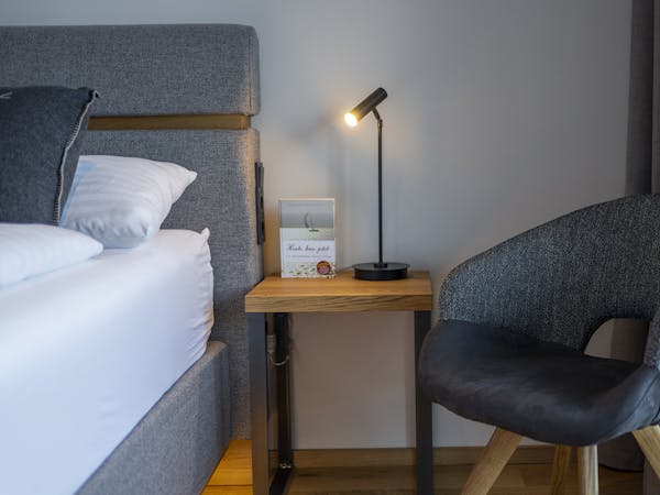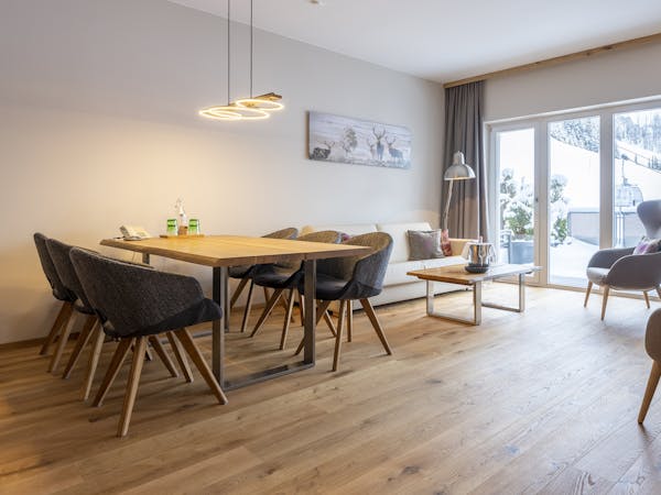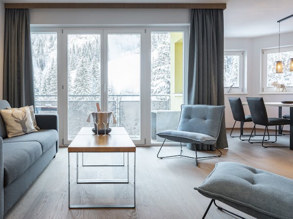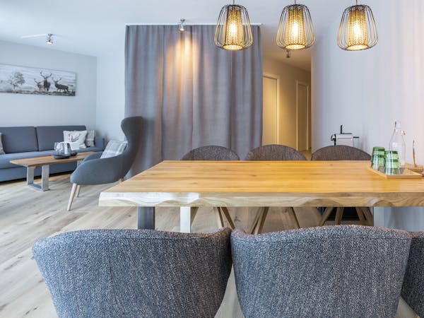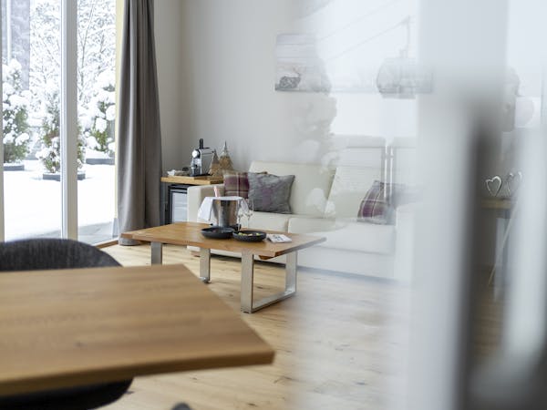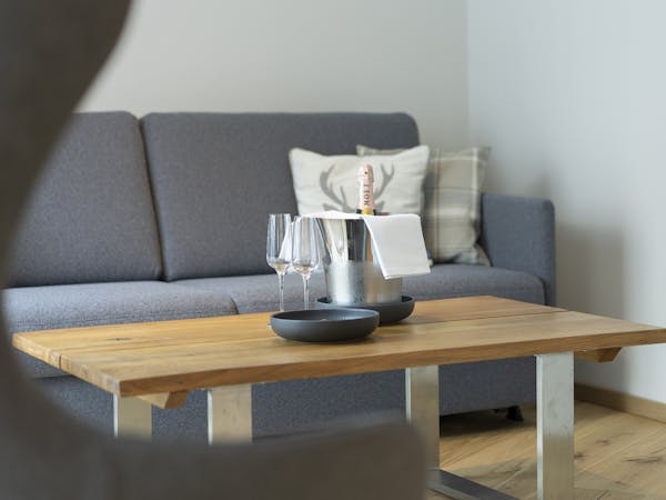 Modern furnished 2-room Superior Suite "Spieleck" with extra space for the whole family or with friends and panoramic mountain view of the Glemmtal mountains for relaxing holidays. Our suite "Spieleck" has 1 separate bedroom, 1 bathroom, living area, fully equipped kitchen, sofa bed for two additional guests and a cosy dining area.