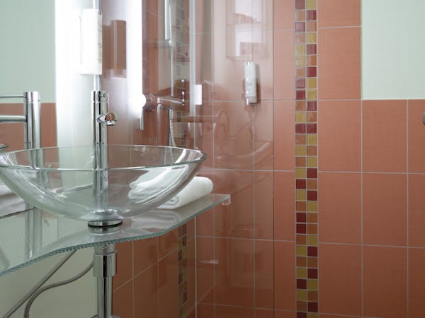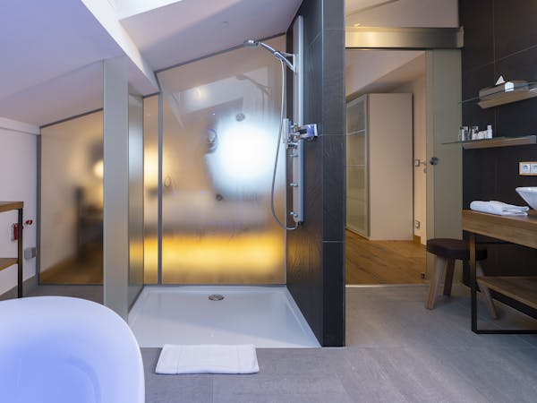 - design bathroom with freestanding double bathtub, heat seat cabin (40ºC), rain shower, washbasin in Alessi design and separate toilet