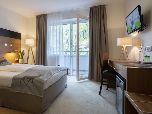 Modern furnished double room with lateral mountain view and a sofa bed for a third person.