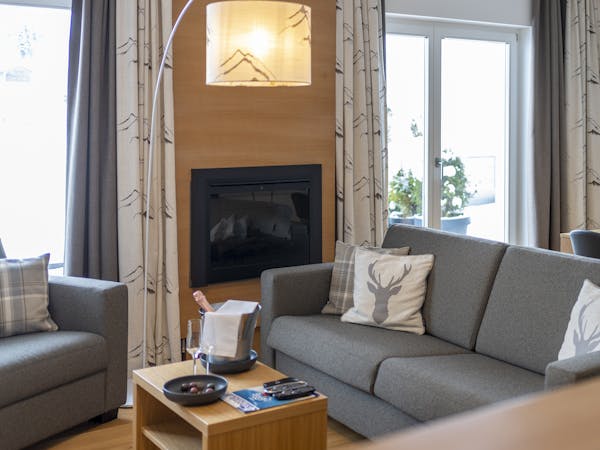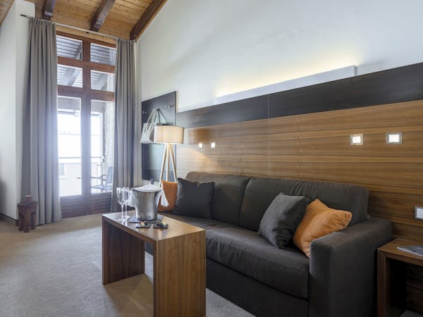 Modern furnished superior suite with panoramic mountain view. The suite offers two separate bedrooms and living area with a sofa bed for a fifth or sixth person.