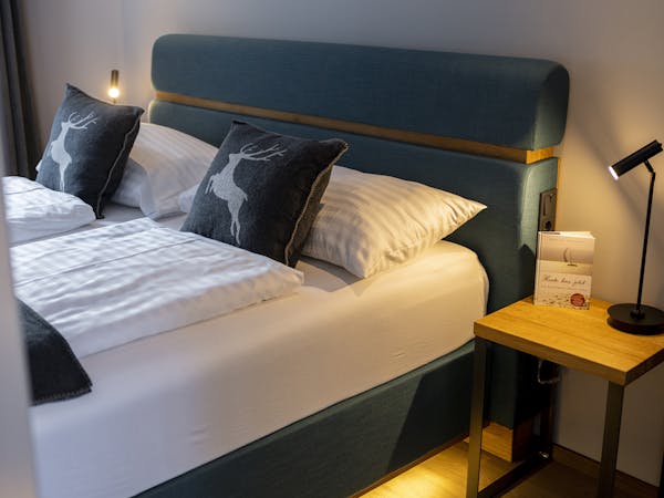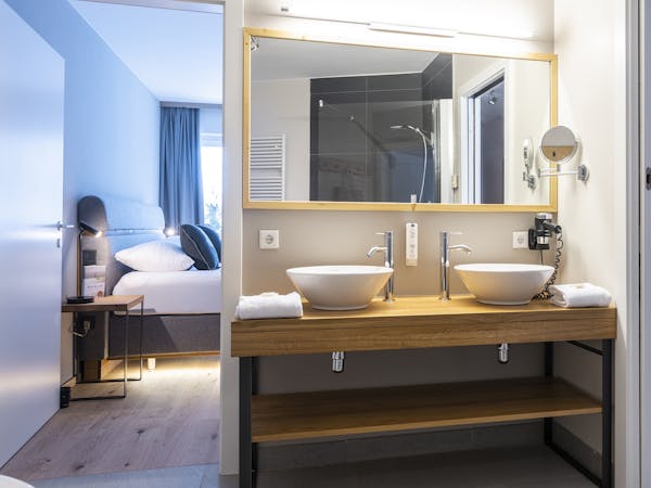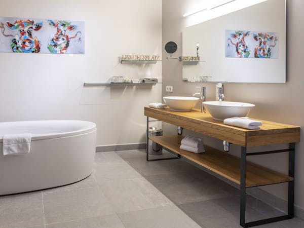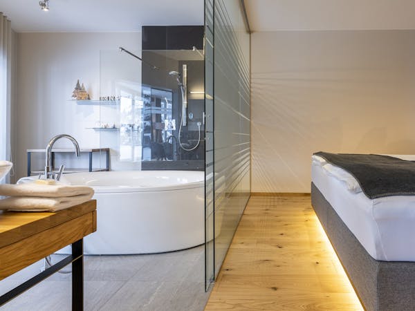 Modern furnished wellness suite with panoramic mountain view and guests looking for something special. The suite offers a large bathroom with double bathtub, heat seat cabin (40ºC), rain shower, washbasin in Alessi design, seamlessly connects to the bedroom and living area with a sofa bed for a third or
