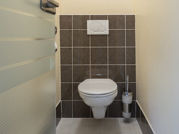 - design bathroom with massage shower, freestanding bathtub and separate toilet