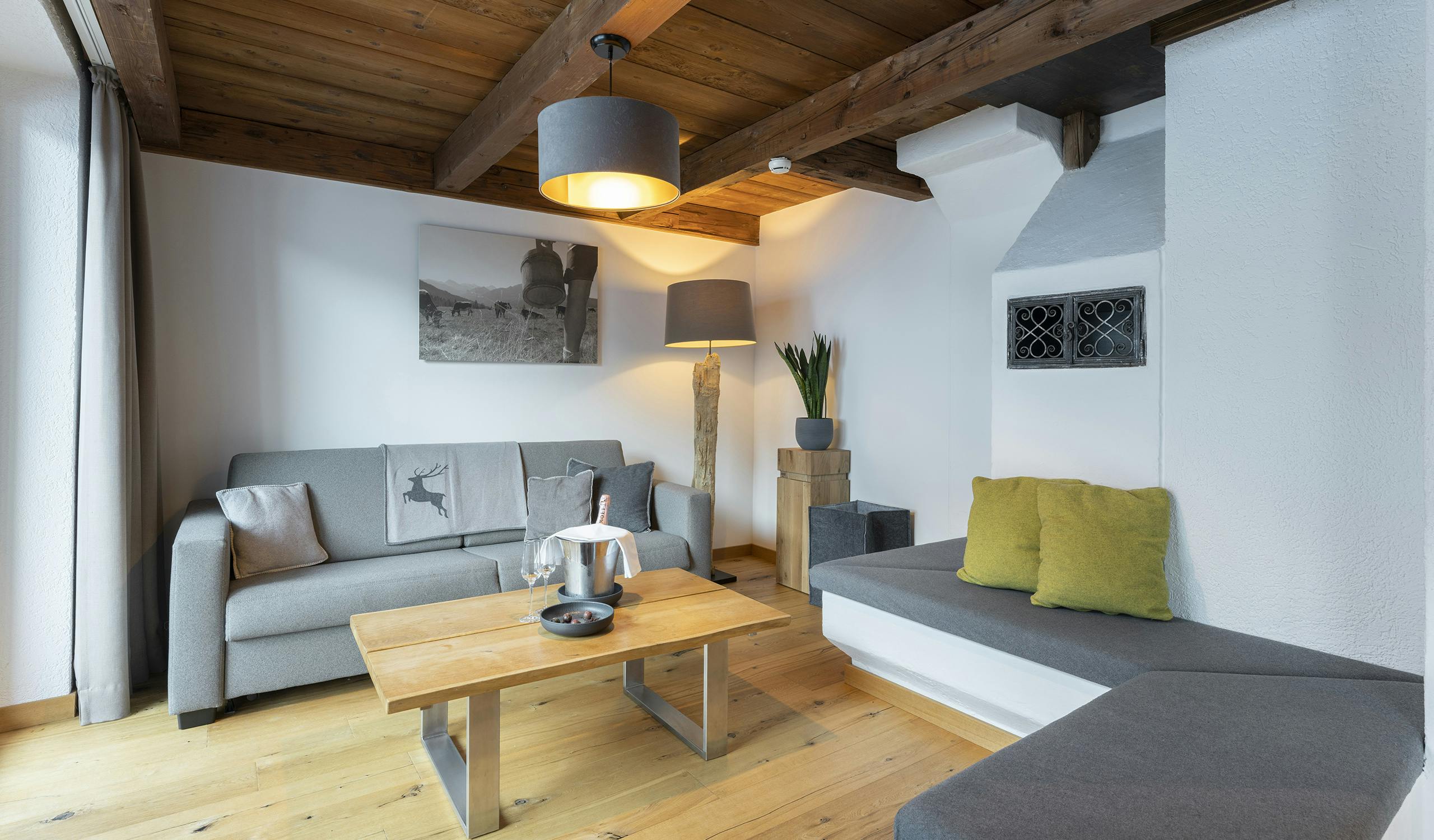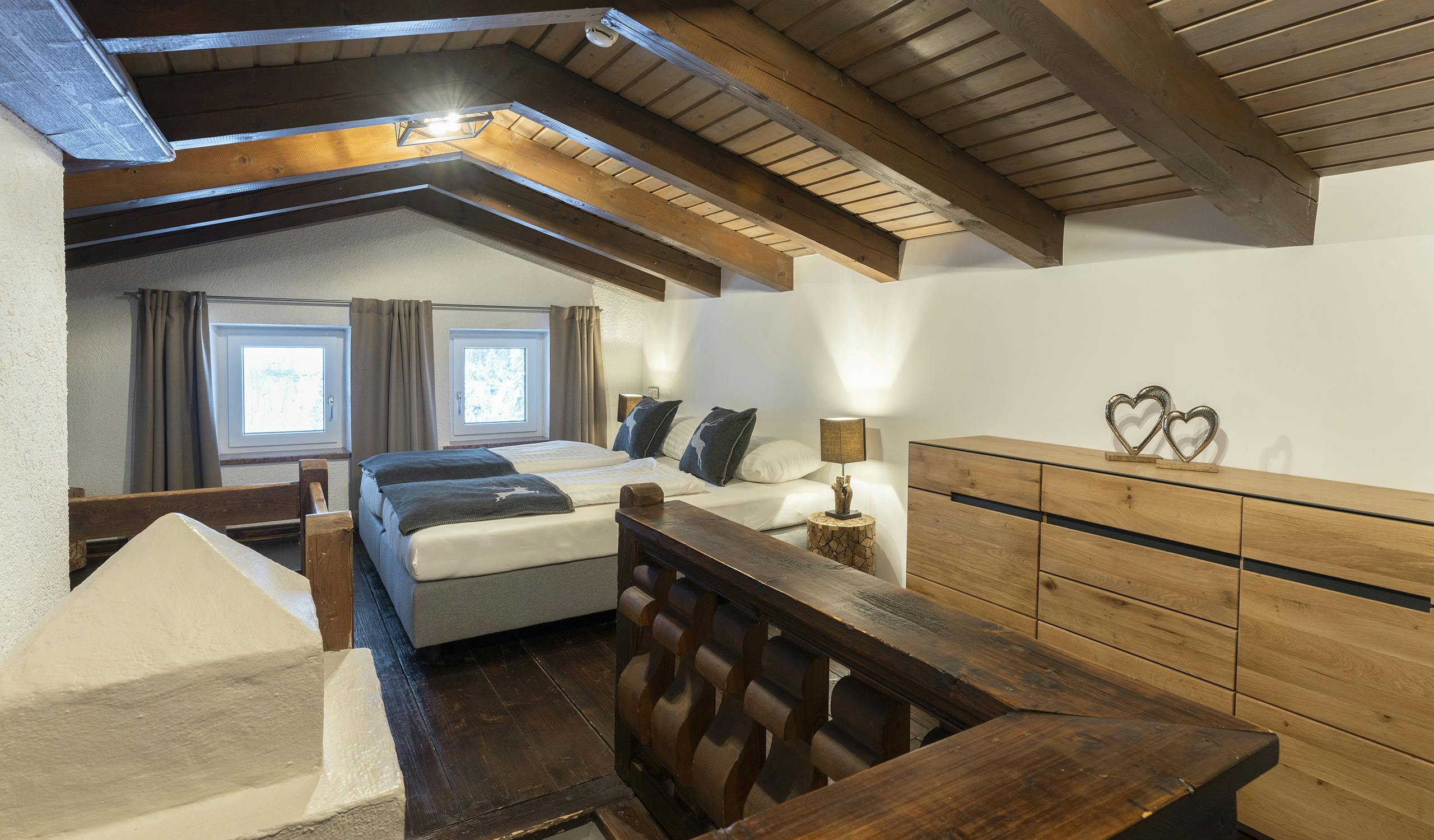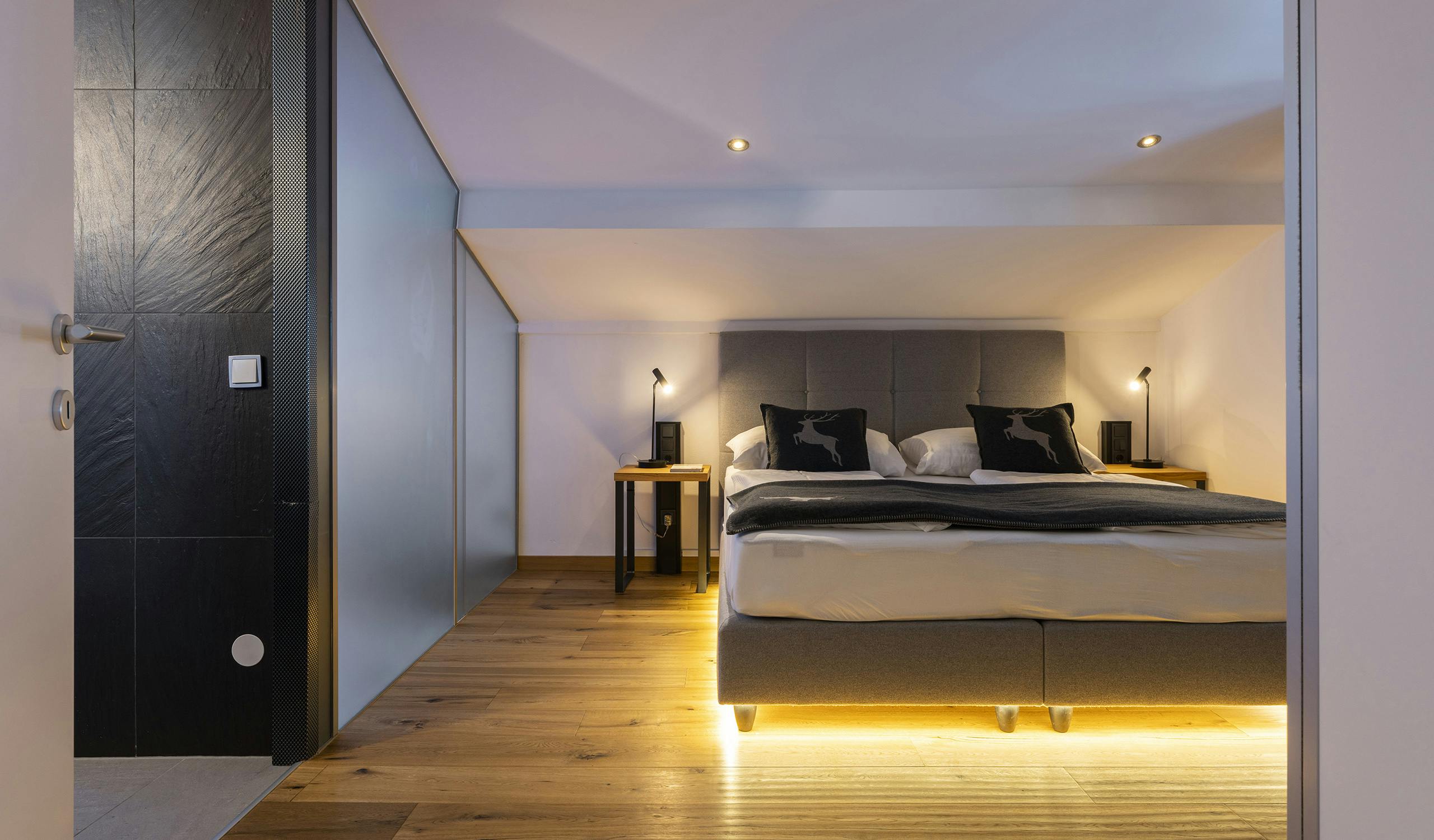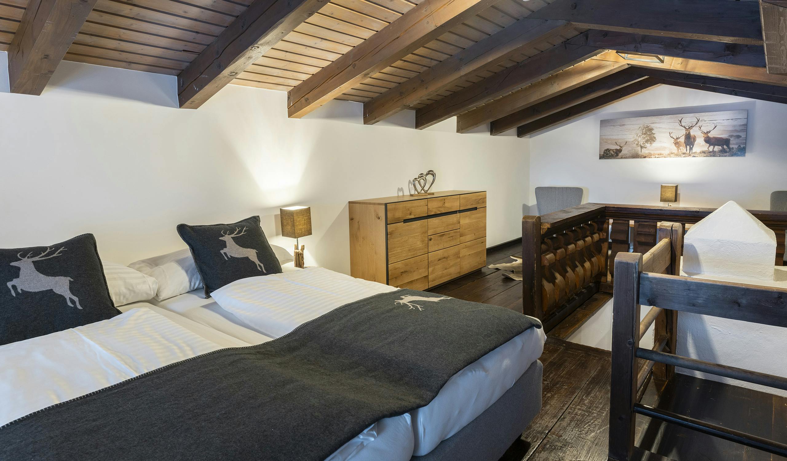 Modern furnished alpine chalet suite with panoramic mountain view and guests looking for something special. The suite offers two separate bedrooms (on a split level) and living area with a sofa bed for a fifth or sixth person.