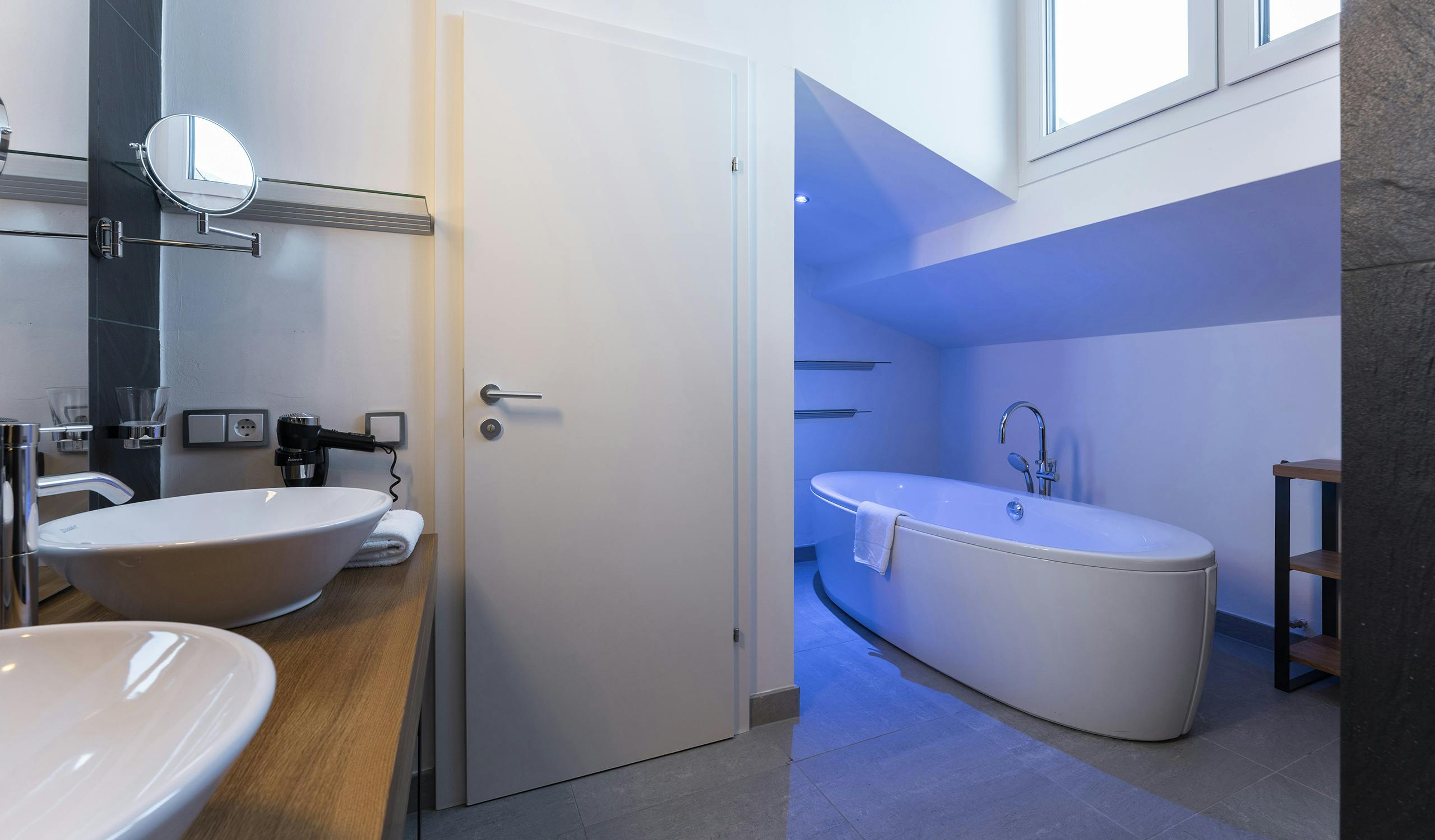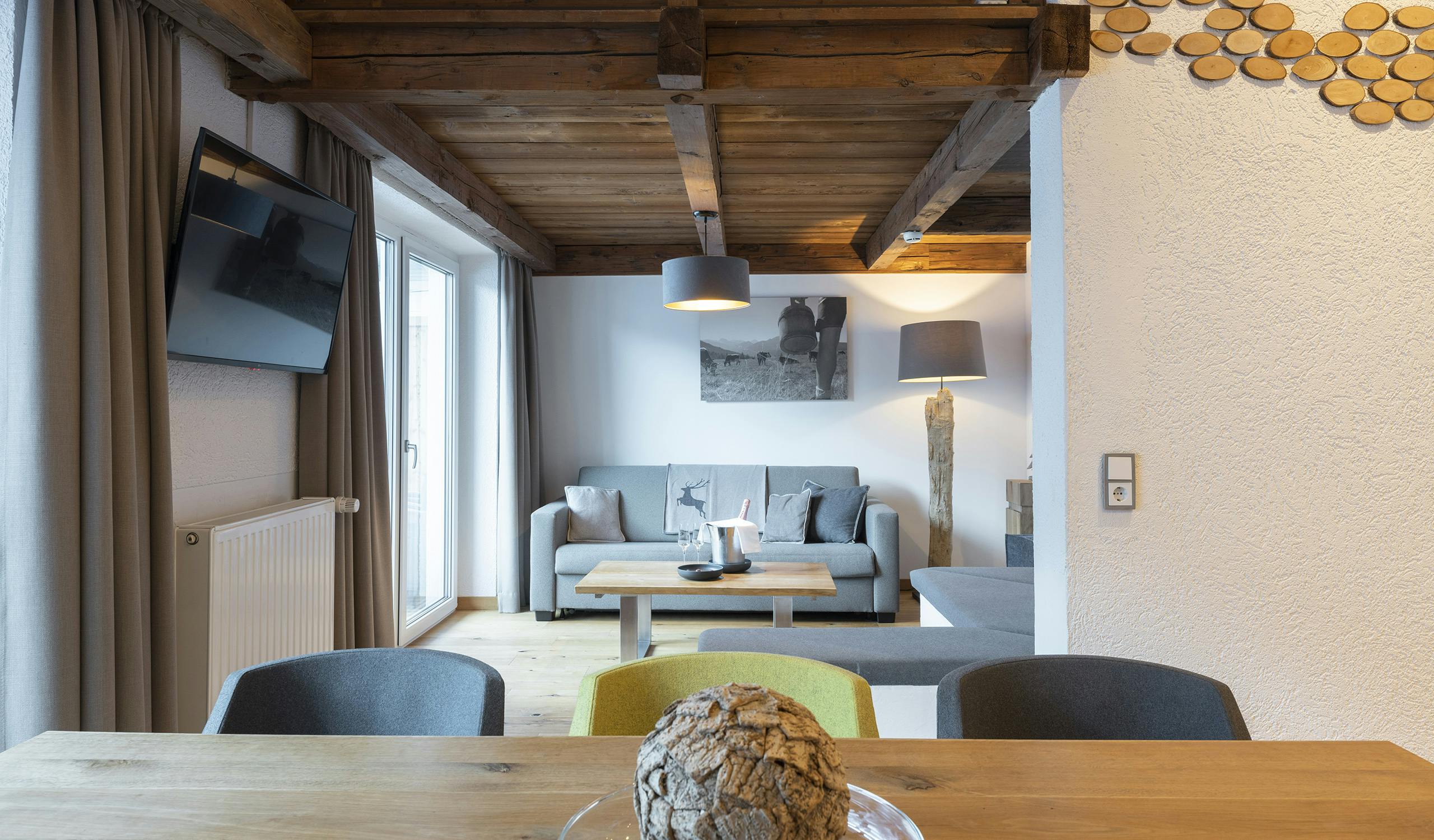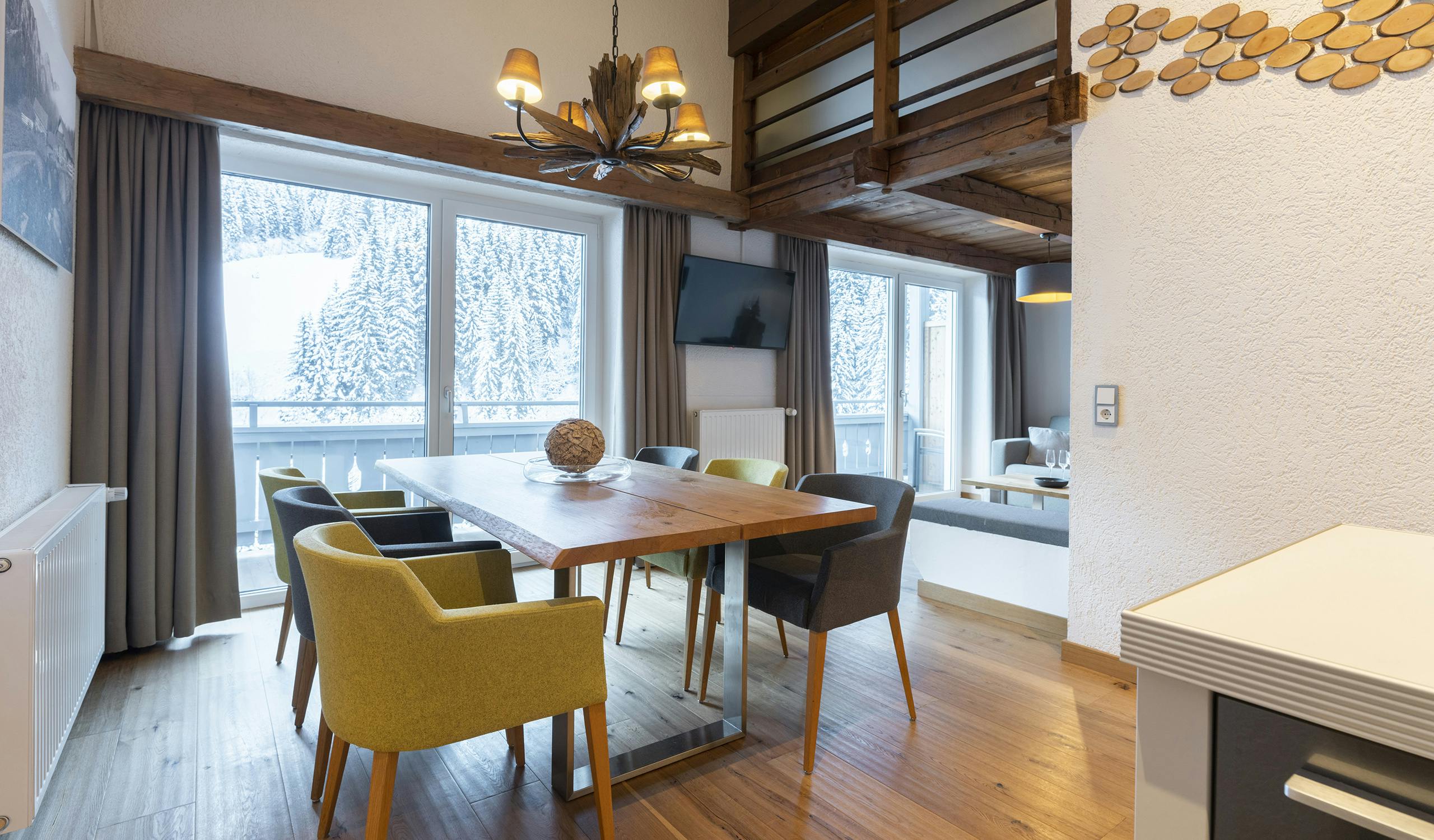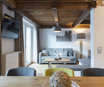 Modern furnished alpine chalet suite with panoramic mountain view and guests looking for something special. The suite offers two separate bedrooms (on a split level) and living area with a sofa bed for a fifth or sixth person.