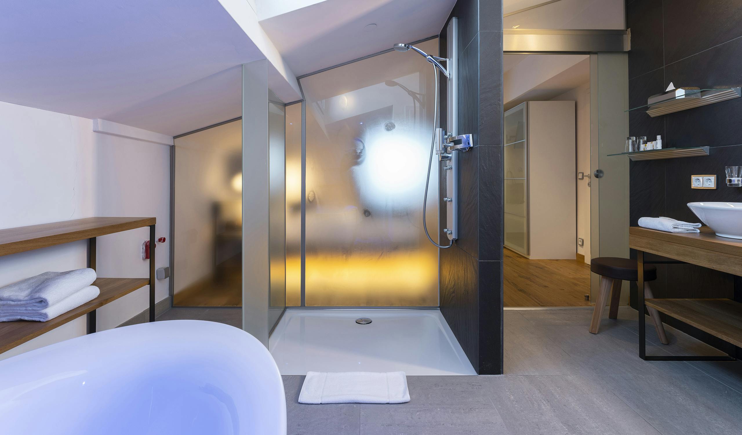 - design bathroom with massage shower, freestanding bathtub and separate toilet