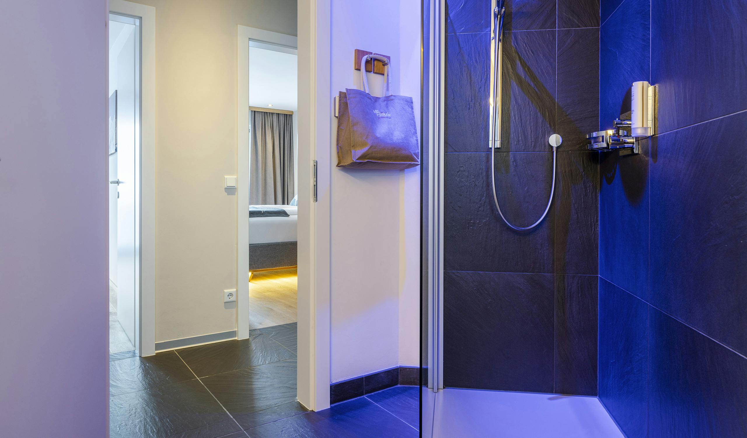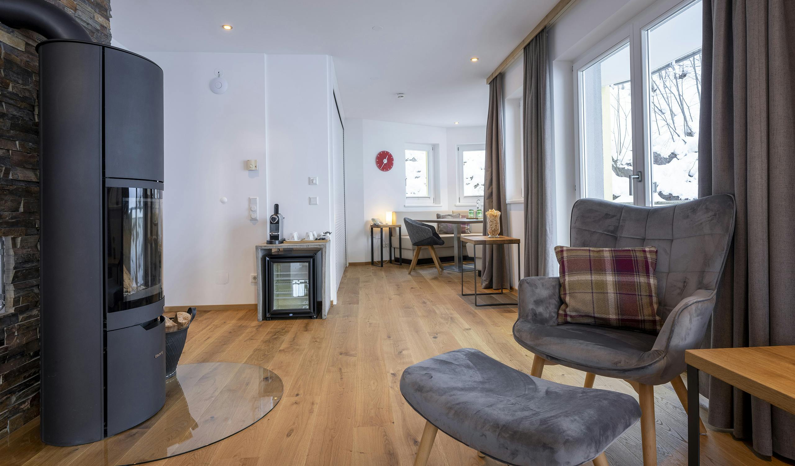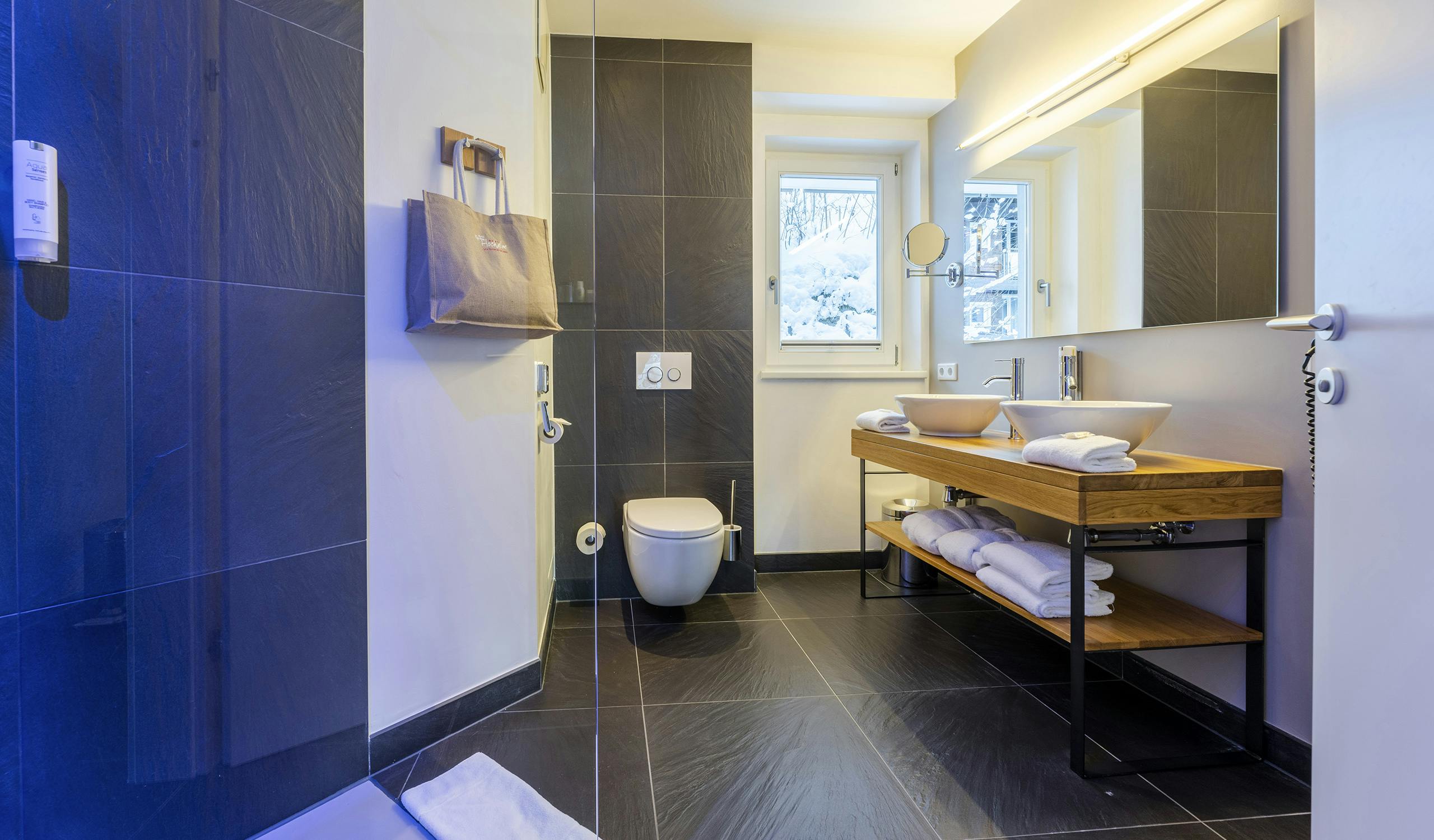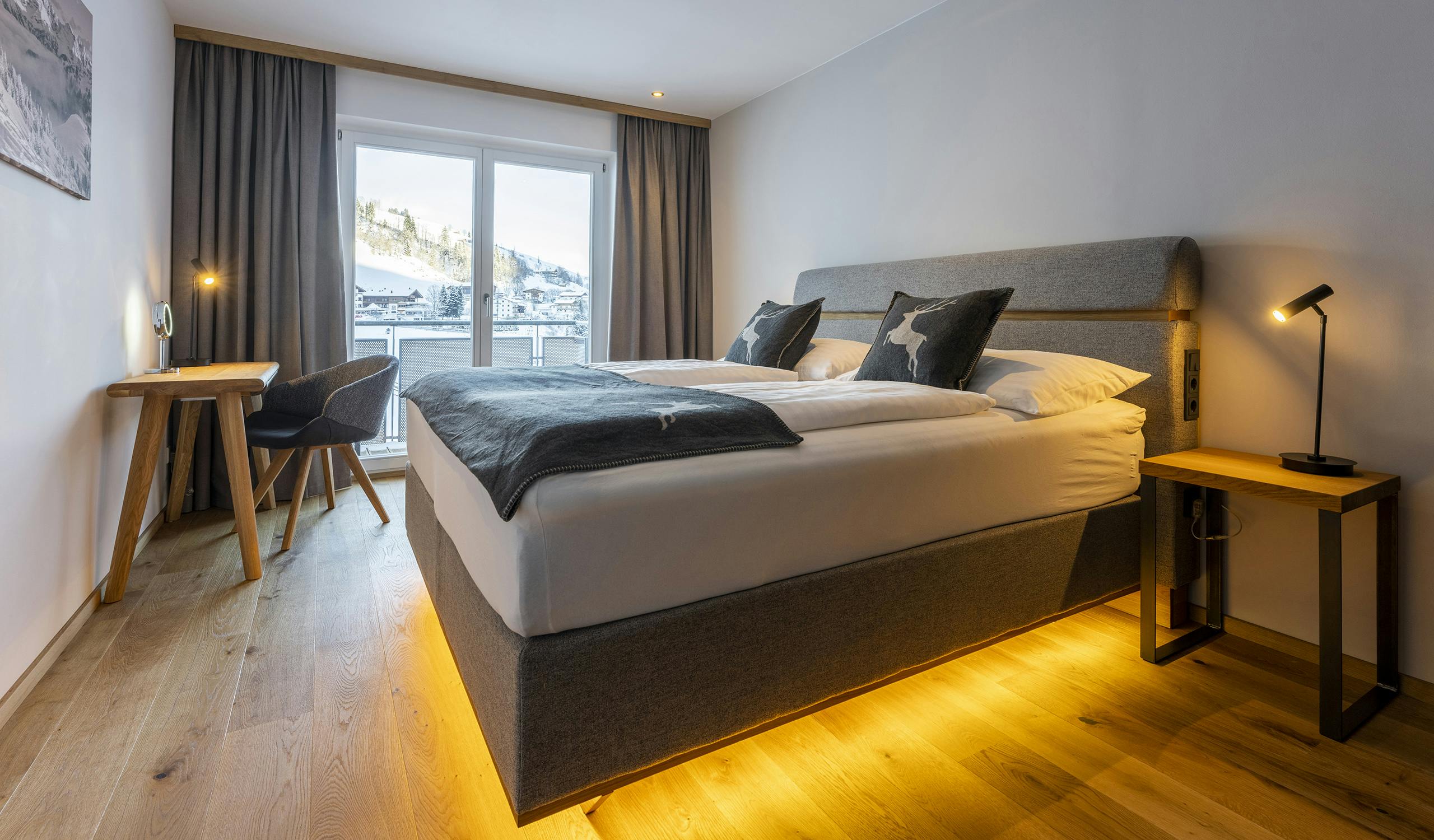 Modern furnished Superior Suite with panoramic mountain view and guests who like a bit extra space for a longer stay. The suite offers two separate bedrooms, two separate bathrooms and living room with a sofa bed for a fifth or sixth person.